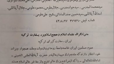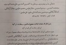تلگراف علمای یزد در پی تبعید آیت الله خمینی به ترکیه