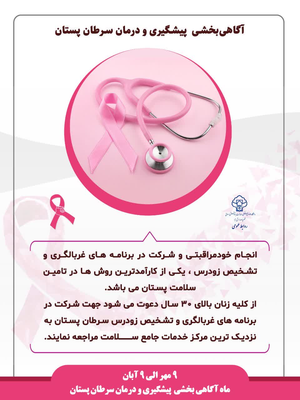 ۹ مهر الی ۹ آبان ماه آگاهی بخشی پیشگیری و درمان سرطان پستان