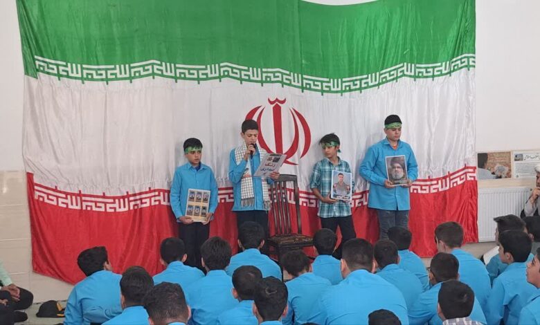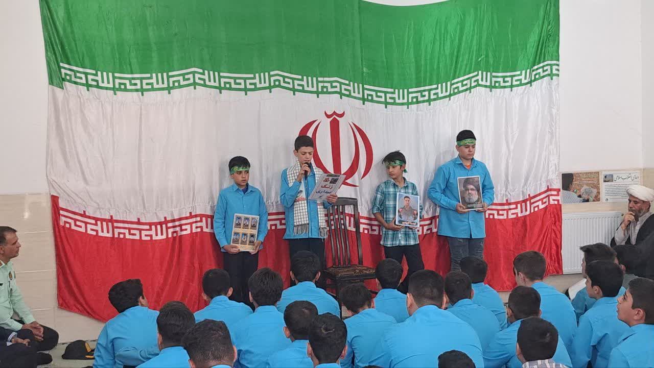 به مناسبت اولین سالگرد شهید نصرالله قهرمان؛نماهنگ “ماهستیم” کار تولیدی و ماندگار دانش آموزان مدرسه برای شهادت این شهید پخش و دانش آموزان به حرمت خون شهدای دفاع مقدس ۱۲ روزه به پرچم کشورمان سلام نظامی دادند ، دهقان قاری ممتاز سوره فتح و مقیمی حافظ کل قرآن ” دکلمه بیداری “را خواند