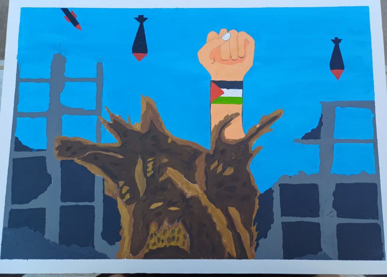 تابلو نقاشی«ایستاده ایم»نوجوان اشکذری تقدیم به هم سن و سال های غزه ای