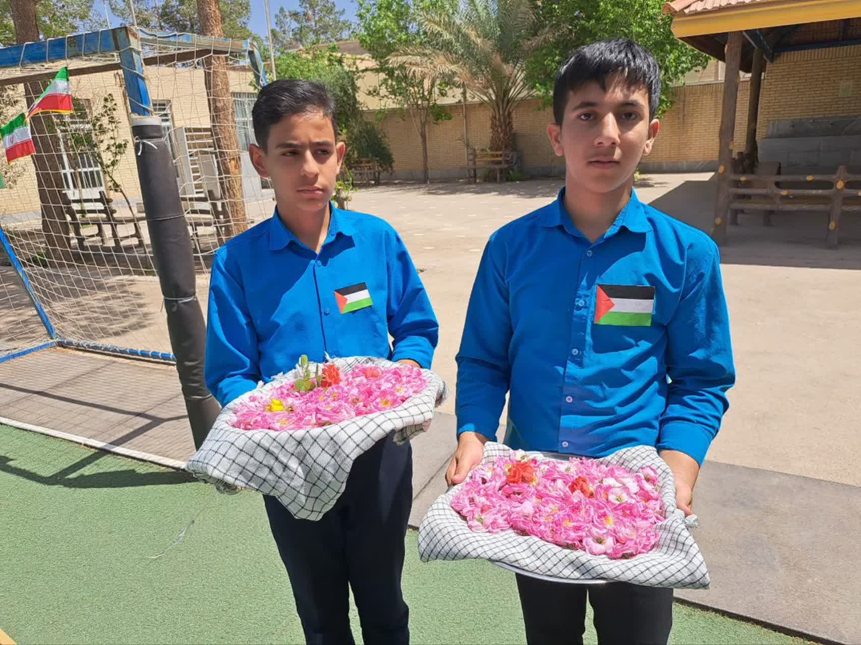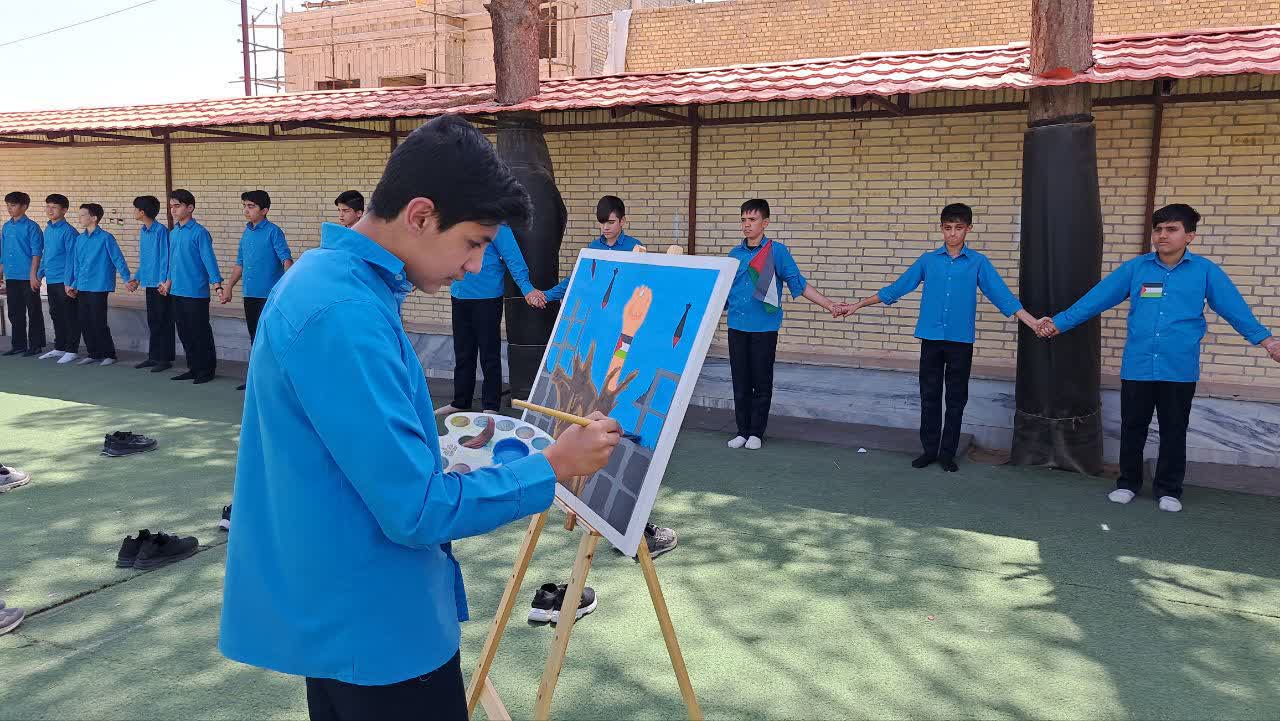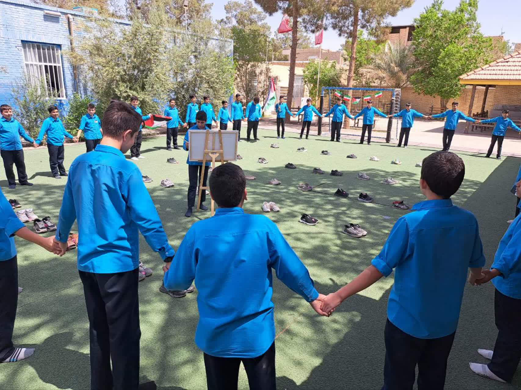 بعد هم این بچه های هنرمند با کمک شورا و بسیج دانش آموزی مدرسه شان کنار هم نشستند و هم وعده شدند جهت عهد با کودکان شهید غزه ، روی حیاط مدرسه بیایند،کفش های خود را وسط حیاط بگذارند و روی کفش ها به نشانه کودکان شهید غزه یک گل محمدی که با خود به مدرسه آورده بودند بگذارند و خودشان با پای برهنه یک زنجیره انسانی به نشانه عهد و حفاظت از راهی که کودکان شهید غزه و نونهالان مقاومت آغاز کرده اند داشته باشند!