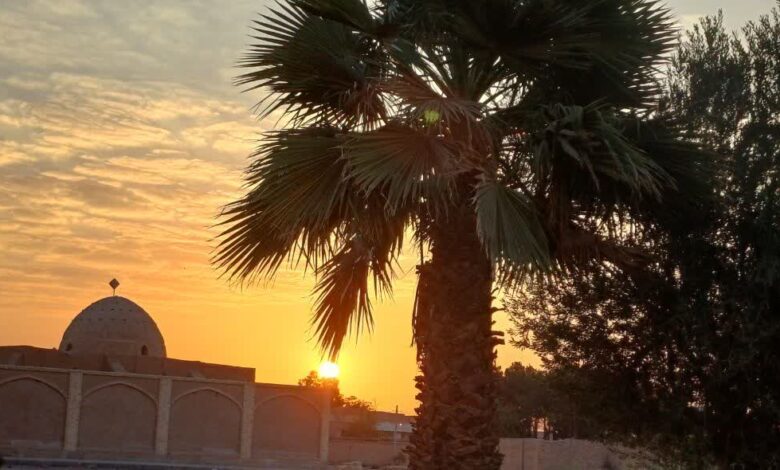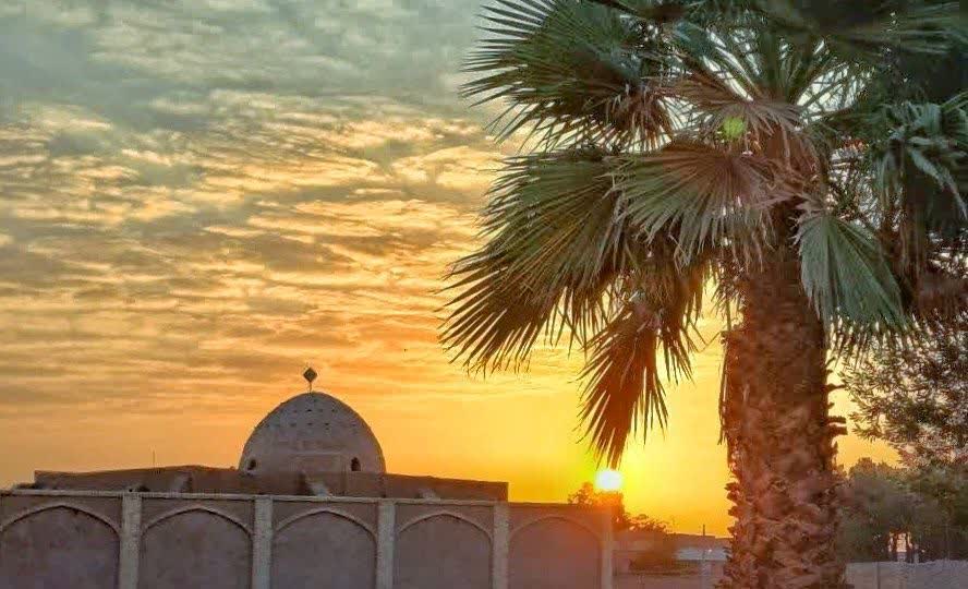 این عکس طلوع کویر، حس خیلی خوبی داره؛ نور نارنجی و طلایی خورشید غروب، ترکیب فوقالعادهای با سیلوئت نخل و گنبد مسجد ساخته