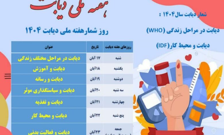 شعار دیابت سال ۱۴۰۴: [ دیابت در مراحل مختلف زندگی (WHO) ؛ دیابت و محیط کار (IDF) ] روز شمار هفته ملی دیابت ۱۴۰۴